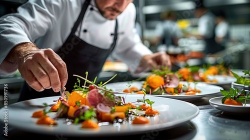 Chef Plating Exquisite Dishes with Colorful Ingredients at Luxury Restaurant