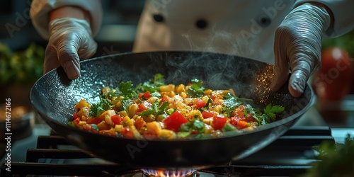 Chef preparing a colorful vegetable stir fry in a wok