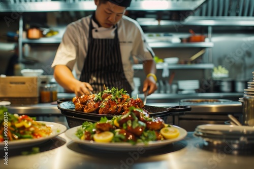 Chef Preparing Delicious Chicken Dish in a Restaurant Kitchen
