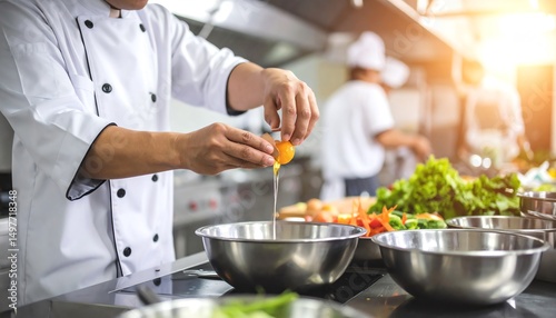 Chef skillfully preparing gourmet dishes in a busy restaurant kitchen surrounded by fresh ingredients and cooking tools