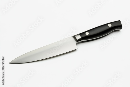 Chef’s knife with black handle on white background, professional kitchen tool, sharp stainless steel blade, culinary preparation concept, minimalist style, copy space, selective focus