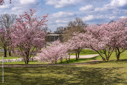 Cherry blossoms in Munich, Germany. Pink cherry blossoms with a blue and cloudy sky background. Spring in Germany.