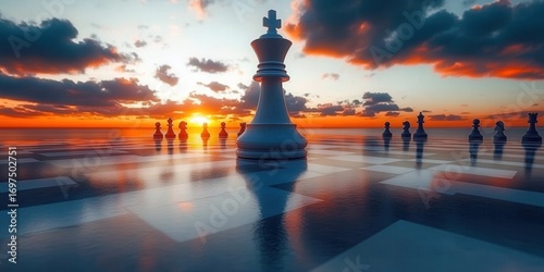 Chess king stands on a reflective chessboard at sunset, a symbol of strategic thinking.