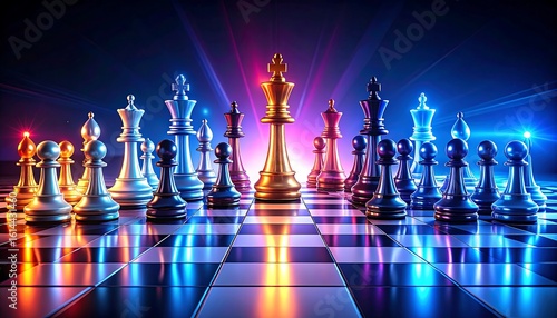 Chess pieces on a board, vibrant lights