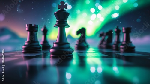 Chess set on a board with the vibrant aurora light in the backdrop.
