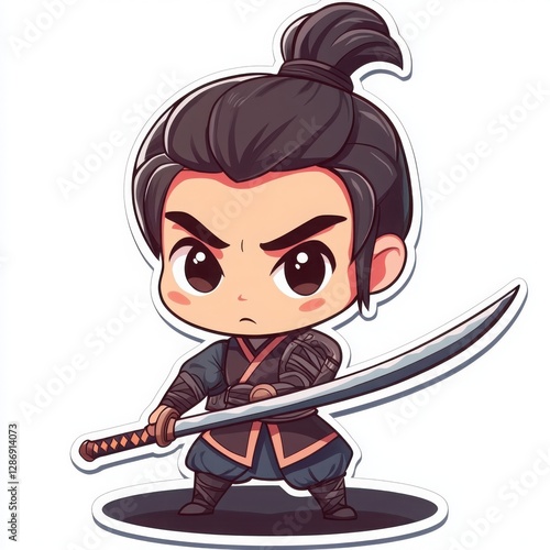 Chibi-style illustration of a young Asian man, a samurai, wielding a katana. Dark and bold colors create a serious mood.