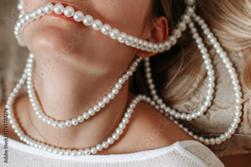 Chic elegant fashion accessories details of white pearl beads and woman's lips
