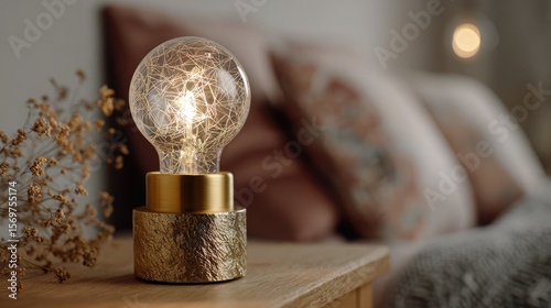 Chic gold lamp with frosted glass bulb casting ambient light in a luxurious bedroom