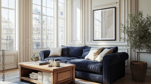Chic living room featuring a navy-blue sofa, wooden coffee table, molding wall accents, and large windows with city view