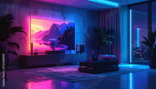 Chic living room showcasing smart home entertainment system with neon visuals for a vibrant and inviting ambiance
