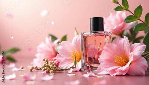 Chic perfume bottle surrounded by pink flowers and petals on a pastel background for fragrance display