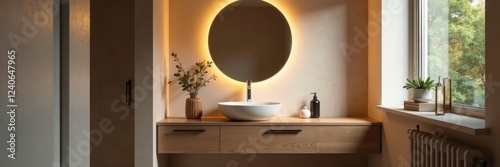 Chic small bathroom, glowing round mirror, floating vanity, bright, modern, calm