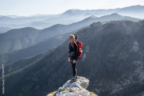 chica en la montaña con una mochila y mar de nubes de fondo
