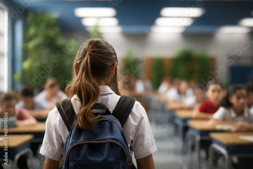 Chica triste de espaldas en el aula. intimidación en la escuela, bullying y discriminacion