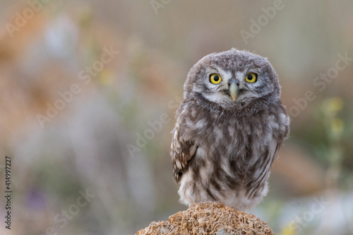 Chick little Owl (Athene noctua) perched on rocks in sunlight