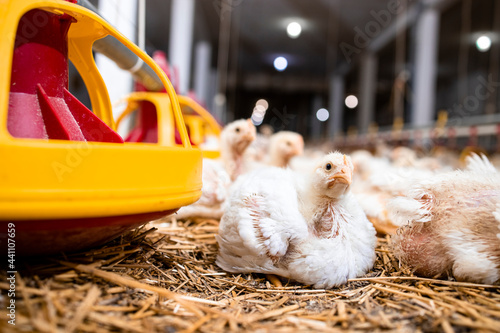 Chicken and feeder with food at poultry farm.