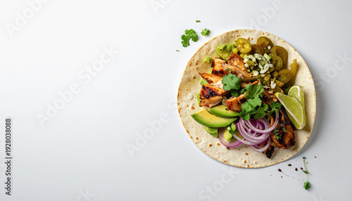 Chicken Tacos with Avocado, Jalapenos, and Red Onion on White