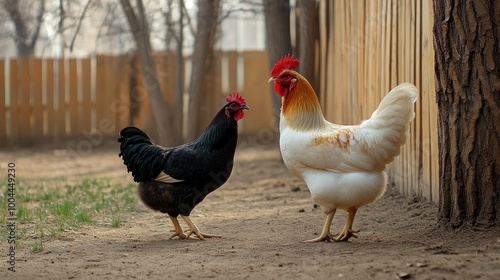 Chickens and a rooster explore a spacious farmyard blanketed in fallen leaves, set against a backdrop of leafless trees and a rustic wooden fence