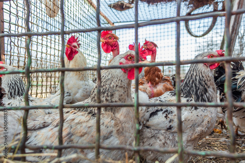Chickens on the farm behind bars