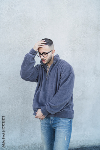 Chico joven tatuado con ropa urbana moderna posando en la calle