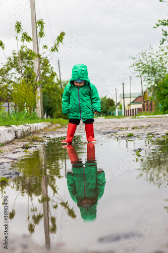 Child. A little boy in a green jacket and red boots plays in the swamp.