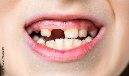Child bad teeth. Boy kid lost front tooth, toothache. Child without one front tooth. No teeth. Yellow teeth. Bad dental health, no teeth, no fluoride, tooth erosion. Portrait boy with bad teeth