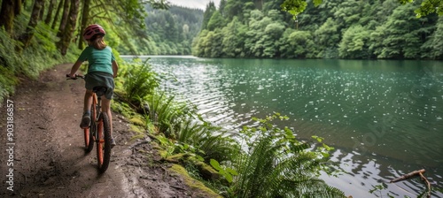 Child Biking Along Scenic Lake Trail with Sparkling Water and Lush Greenery - Nature Adventure