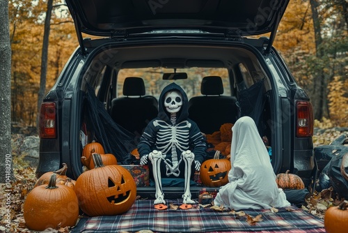 Child dressed as a skeleton sitting in the trunk of a car at Halloween, surrounded by pumpkins, spider webs, and floral decorations, with hands covering their face and a plaid blanket beneath them.