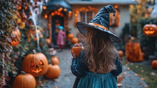 Child Dressed as Witch with Pumpkin Basket During Halloween Trick-or-Treat in Decorated Yard