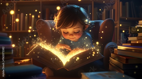 Child engrossed in magical book, surrounded by bookshelves and glowing sparks.