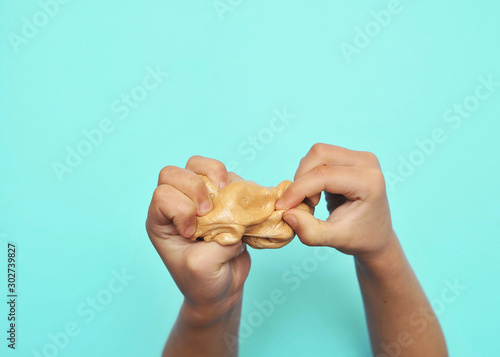 Child hands with slime on blue background.