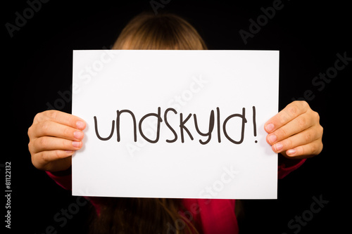 Child holding sign with Danish word Undskyld - Sorry