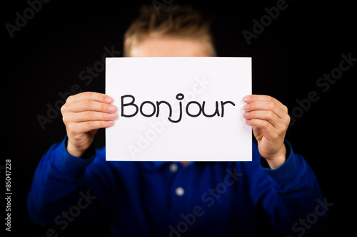 Child holding sign with French word Bonjour - Hello
