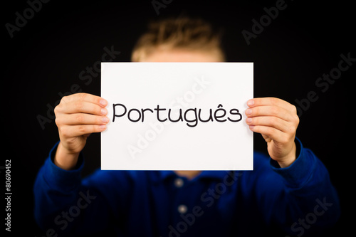 Child holding sign with Portuguese word Portugues - Portuguese i