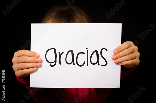 Child holding sign with Spanish word Gracias - Thank You