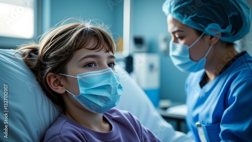 Child Patient Wearing Protective Mask in Hospital Bed with Nurse