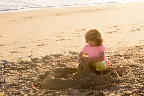 Child play with sand on summer beach. Kid build sandcastle. Kids summer vacation.