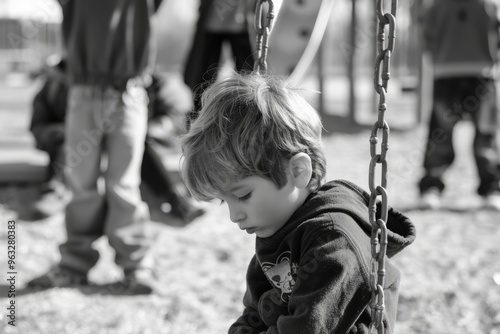 Child Sitting on a Swing Alone, Looking Down as Others Play Together