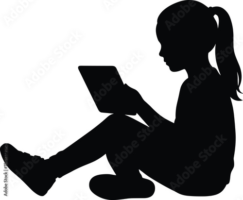 Child with tablet silhouette, digital learning pose, black flat icon, screen time moment, CAD drawing flat vector illustration