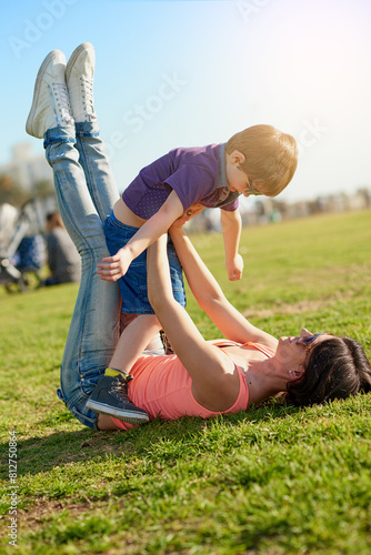 Child, woman and play in grass for fun, bonding and floor in nature or park. Mother, family and garden for son and vacation for calm and rest outdoor, parent and picnic field with smile on weekend
