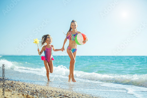 Children at sea play merrily. Two sisters run, jump on the beach in summer. High quality photo.