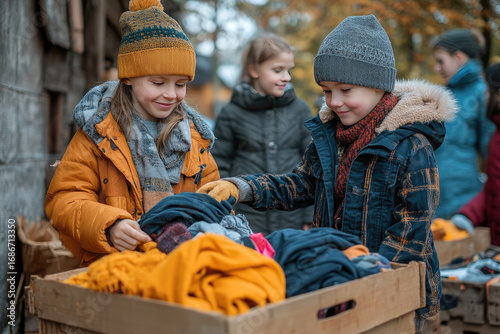 Children donating clothes and food to local shelter during Martinstag charity event, autumn atmosphere with community spirit and kindness, copy space