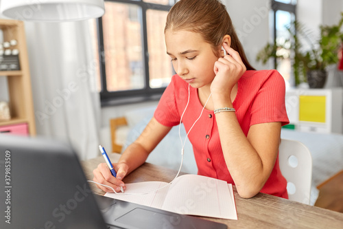 children, education and distant learning concept - teenage student girl in earphones with laptop computer writing to notebook at home