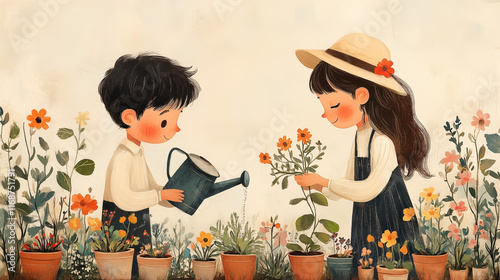 Children gardening together with flower pots, spring activity concept