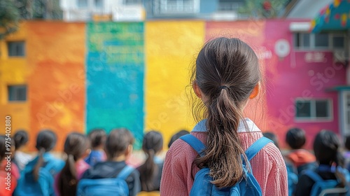 Children gathered in front of a colorful mural during a school outing, observing art in an outdoor setting on a sunny day