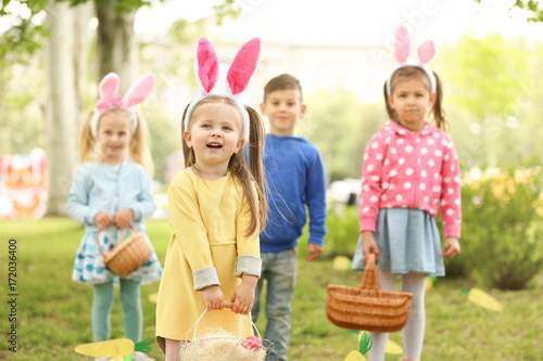 Children having fun in park. Easter egg hunt concept