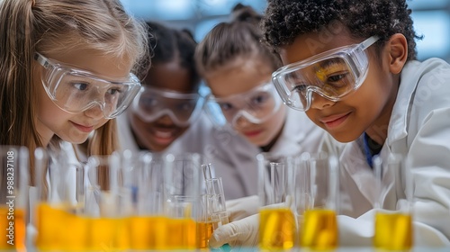 Children in Lab Coats Performing a Science Experiment with Yellow Liquid in Test Tubes