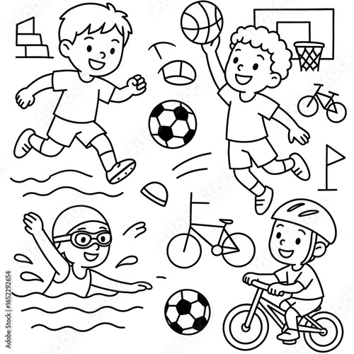 Children play various sports, including football, basketball and cycling in the style of children's coloring
