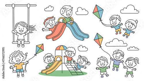 Children playing in a playground line art vector illustration of kids on swings and slides enjoying outdoor activities