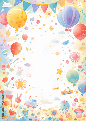 Children's day colorful frame with a bunch of balloons and flowers. The balloons are in different colors and sizes, and the flowers are scattered throughout the frame. Scene is cheerful and playful